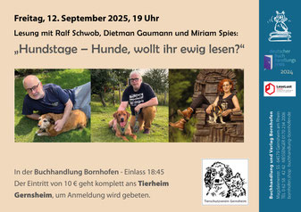 Ein literarischer Abend mit Ralf Schwob, Dietmar Gaumann und Miriam Spies. Unter dem Motto "Hundstage - Hunde, wollt ihr ewig lesen" präsentieren die drei Autoren Auszüge aus ihren Werken, in
